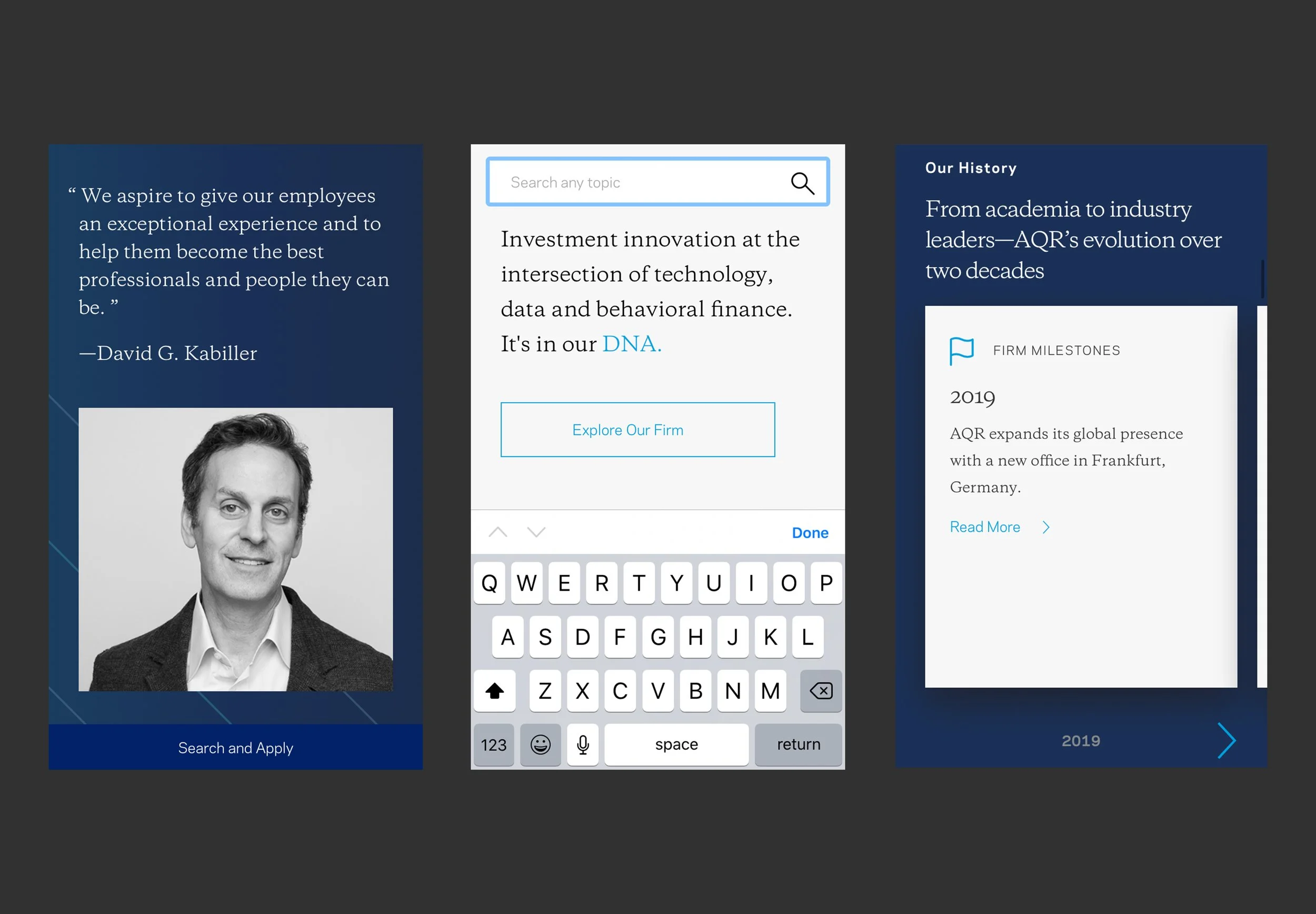 AQR Investments is a leading investment firm specializing in diverse portfolios and the application of behavioral finance strategies. To modernize their digital presence, AQR asked us to embark on a brand refresh and website redesign, aiming to create a sophisticated and intuitive experience that reflected their expertise and authority. The goal was to present complex financial information in a visually compelling and easily digestible format, evoking the feeling of flipping through a high-end financial magazine.